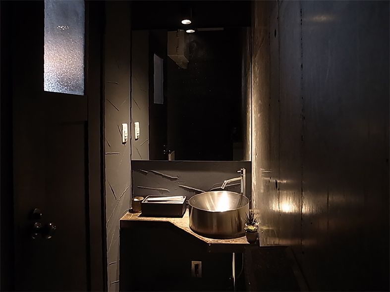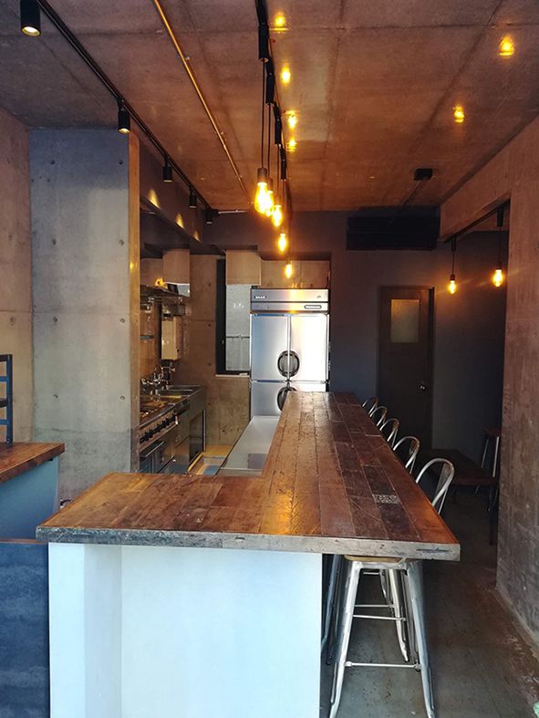 お店の顔となるメインカウンターはメイプル古材を用いており、床、壁、天井はモルタルやコンクリートのグレー色と左官で仕上げた黒色を基調とし、カウンター上での物事が浮かび上がるようにマテリアルの選択をしている。カウンター上ではオーナーが選んだお皿、腕を振るった料理とそれに合うワインが並び、食事を通してオーナーとお客様、またはお客様同士のコミュニケーションの誘発の場となり、このお店に来たからこそ味わえるような楽しい一時を提供することを目指しています。