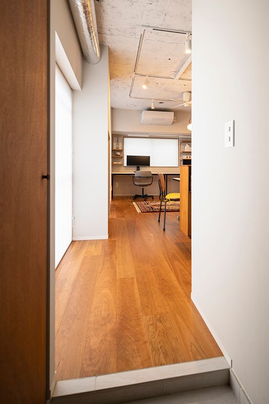 玄関を抜けると、LDKが目に入ります。日中はミーティングスペースとしても使用できるような場所としており、その一画の壁一面が2人分のデスクスペースとなっていて、LDK全体がワークスペースとして使えるように考えています。